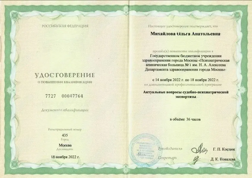 Михайлова Ольга Анатольевна является автором уникальной программы реабилитации для пациентов с двойным диагнозом (сочетание психических расстройств и зависимости), которая позволила существенно улучшить показатели восстановления у пациентов. Её методика сочетает медикаментозное лечение с интенсивной психотерапией и групповыми сеансами, что дало значимые результаты в долгосрочной ремиссии.
